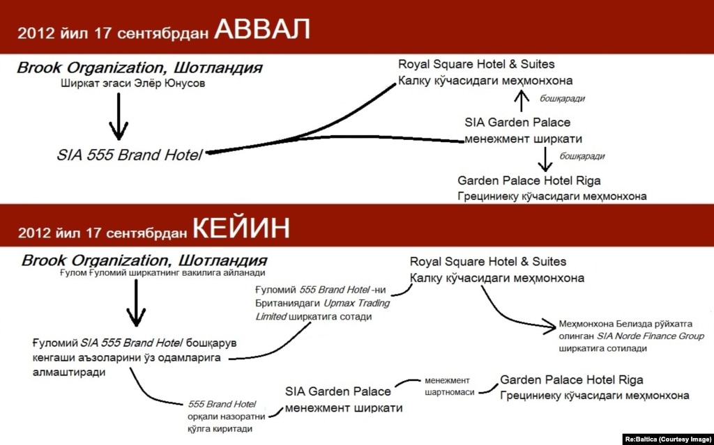 К этому времени Скудра уже ушел с гостиничного бизнеса. В 2010 году одноклассник Абдуллаева, профессиональный борец Эльёр Юнусов приорел гостиницу Royal Square Hotel через зарегистрированную в Шотландии компанию Brook Organization. Впоследствии Юнусов выкупил фирму Скудры Garden Palace, занимавшейся управлением гостиницы.
