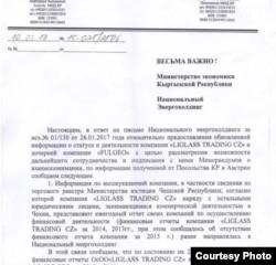 Информационное агентство "24.kg" опубликовало копию письма МИД Кыргызстана, где оно рекомендовало Нацэнергохолдингу и Министерству экономики не продолжать сотрудничество с чешской компанией ОсОО "Liglass Trading".