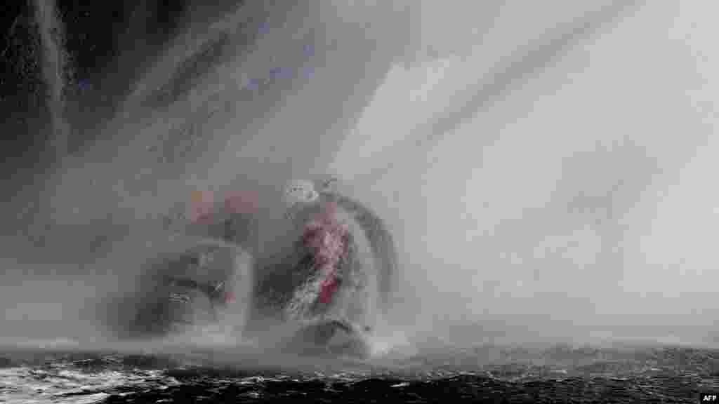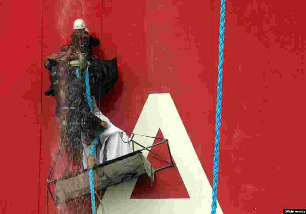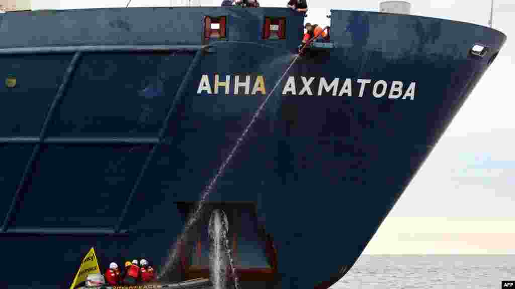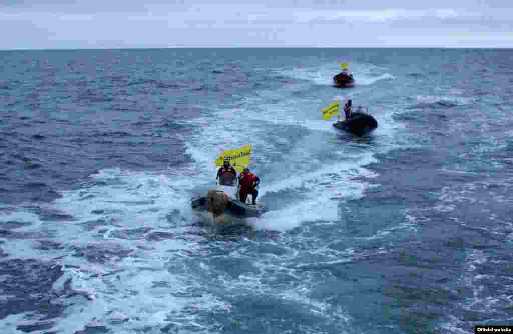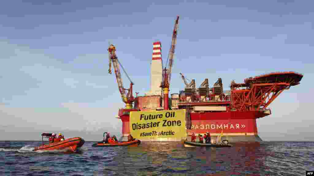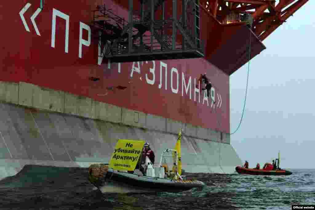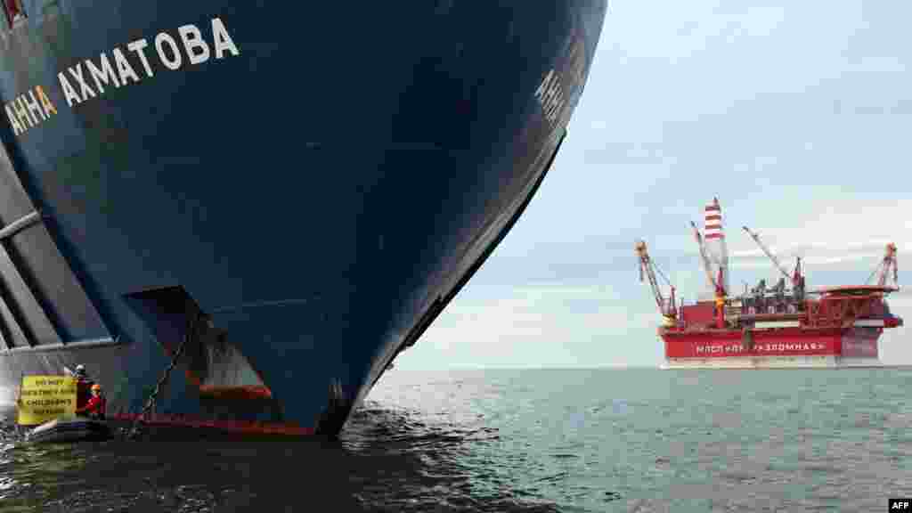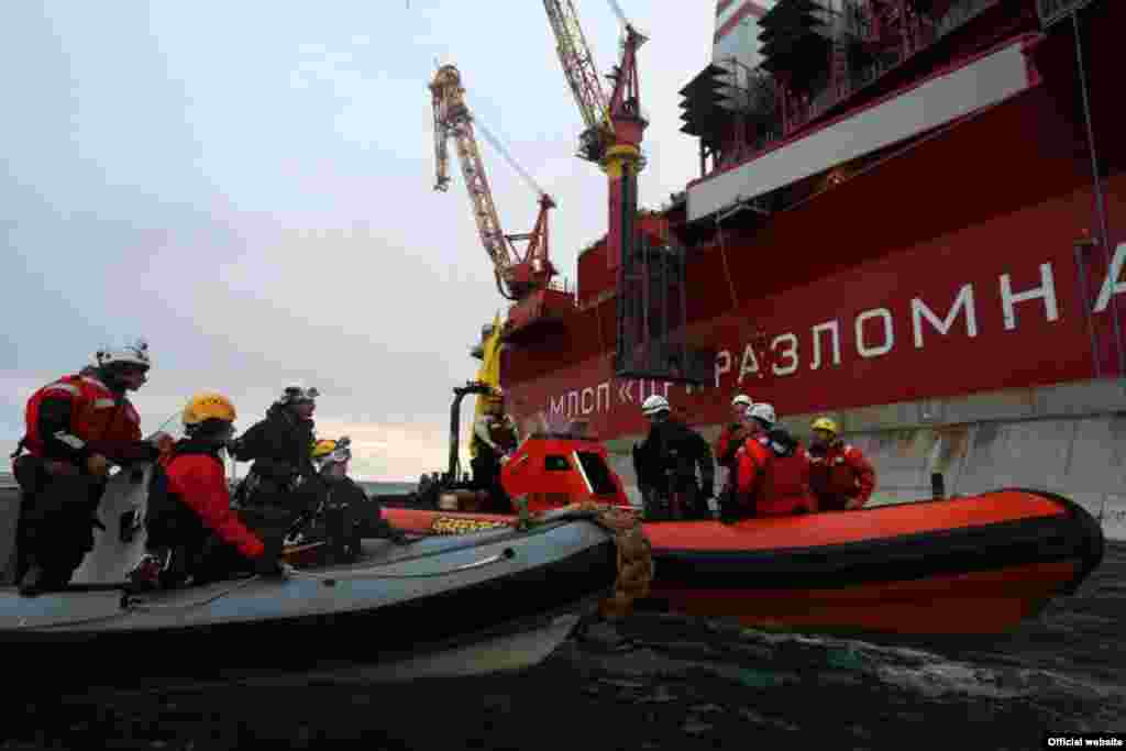 Russia -- Greenpeace activists board Gazprom’s ‘Prirazlomnaya’ Arctic oil platform somewhere off Russian north-eastern coast in the Pechora Sea, 24Aug2012