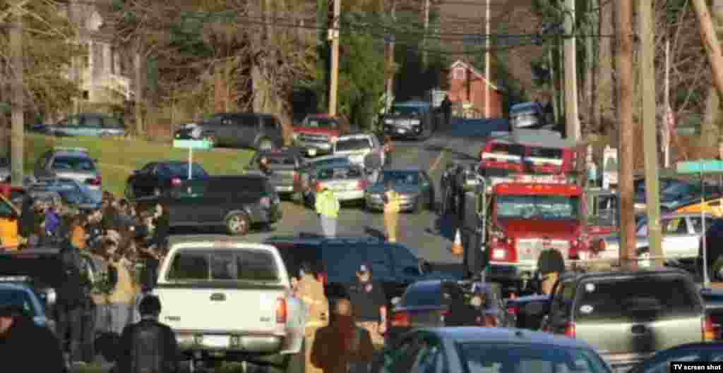 Жители города Ньютаун несут цветы к месту трагедии